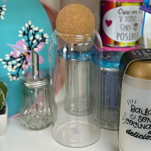 FRASCO/BOTELLA CON TAPA ESFERA DE CORCHO LISO 1100CC Elegí este frasco de vidrio liso con tapa esfera de corcho, ideal para conservar y presentar tus productos con estilo y funcionalidad. Con una capacidad de 1100 cc, es perfecto para almacenar desde alimentos hasta elementos decorativos.