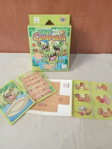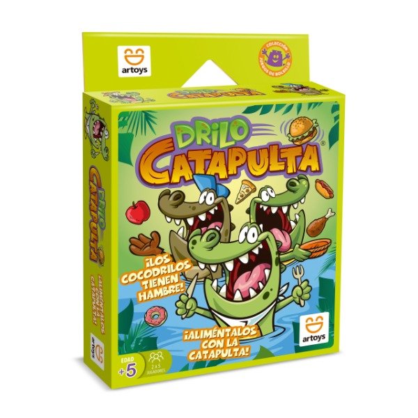 . Un jugador lanza un alimento con la catapulta para alimentar a los cocodrilos. Si logra su objetivo, vuelve a lanzar, de lo contrario será el turno de su adversario. ¿Quién tendrá más destreza para alimentar a estos simpáticos cocodrilos?