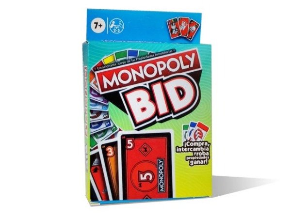El juego Monopoly Subasta es un juego de azar, suerte y estrategia, en el que los jugadores hacen ofertas en subastas a ciegas, pagan con cartas de Dinero, roban propiedades con cartas de Acción y cambian su suerte con las cartas Comodín.