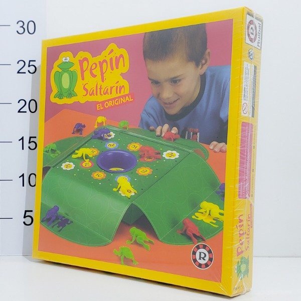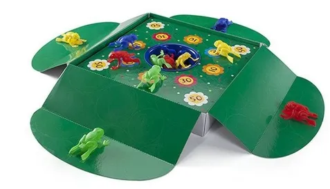 Componentes del juego: 1 tablero con recipiente plástico en el centro,4 rampas de cartulina para lanzamiento,16 sapitos (4 de cada color),1 reglamento.