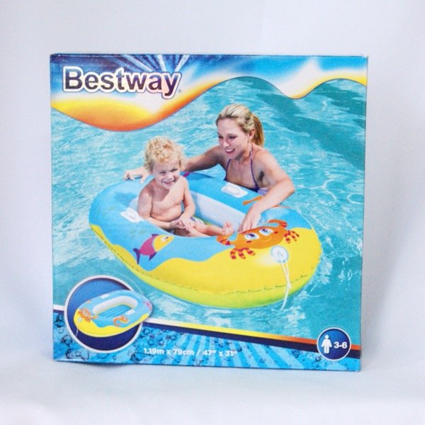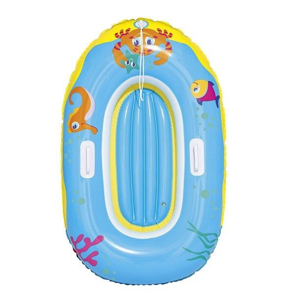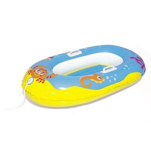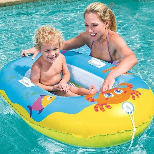 Disponible en colores azul y amarilo, este inflable tiene asas de gran resistencia para que los niños puedan agarrarse, así como una base inflable para una mayor comodidad.