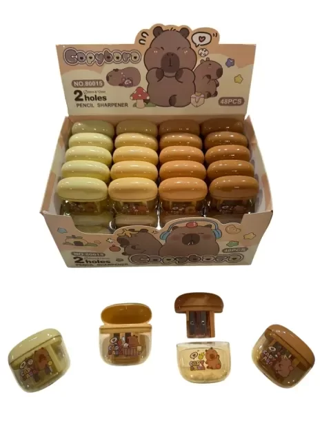 Sacapuntas Doble Capibara: la herramienta ideal para mantener siempre listos tus lápices. Cuenta con dos tamaños diferentes para todo tipo de puntas, y su depósito con tapa evita que los restos de lápiz se esparzan. Perfecto para la escuela, oficina o tu espacio de trabajo en casa. Diseñado para ser práctico y duradero, este sacapuntas acompaña tu día con sencillez y eficacia.