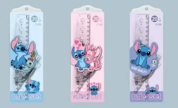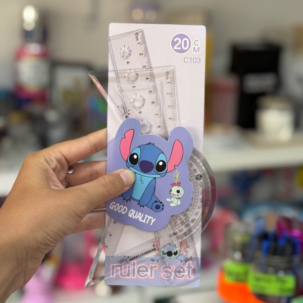 Este práctico set incluye 2 escuadras, 1 regla y un semicírculo, ideales para todas tus necesidades de geometría. Viene en un estuche transparente que facilita su almacenamiento y transporte. Además, cada set incluye un cartón surtido con un dibujo de STICH, un detalle encantador que hace único a este producto, ideal para estudiantes y amantes de la papelería.