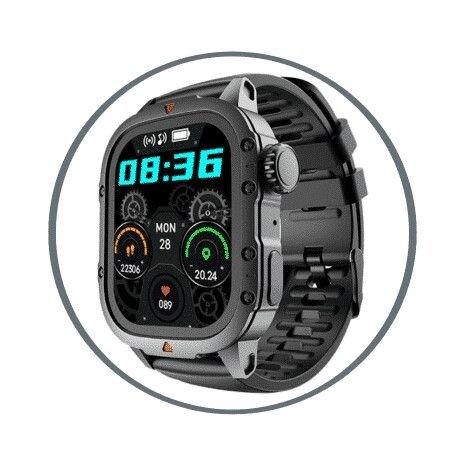 Reloj inteligente económico y funcional, ideal para uso diario, con pantalla táctil, monitor de salud (ritmo cardíaco, podómetro), notificaciones de llamadas/mensajes, control de clima y música, batería de varios días, resistencia a salpicaduras (IP65), y se conecta a la app HiWatch Plus para una experiencia completa.
