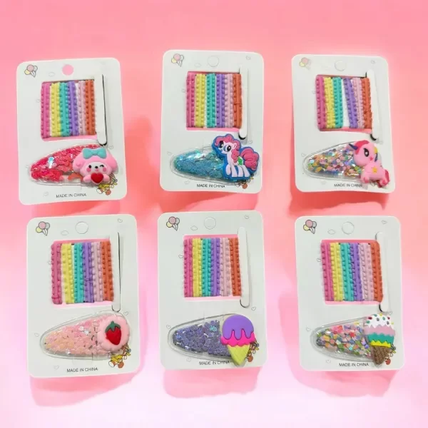 Descubre el set perfecto para realzar tu look. Este conjunto incluye una hebilla con glitter y seis colitas para el cabello, ideales para cualquier ocasión.