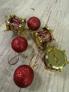 SET DE 12 ADORNOS TAMBORCITO + BOLITAS (2384): Dale un toque especial a tu decoración con este encantador set que incluye 12 adornos de tamborcito y bolitas, cada uno con un colgante para facilitar su colocación. Los adornos miden 2.5 cm, ideales para ambientar cualquier espacio con un estilo delicado y festivo. Perfectos para crear ambientes cálidos y alegres en tu hogar o evento.