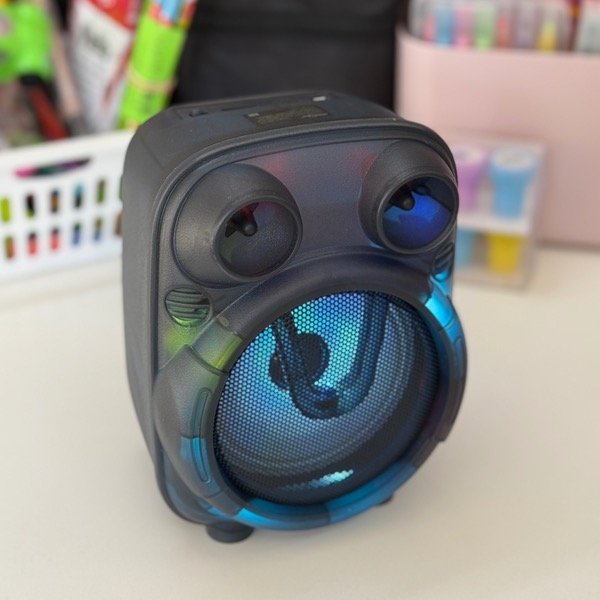 Parlante bluetooth de 4 pulgadas, su diseño llamativo y festivo incluye luz LED multicolor que se sincroniza con la música.